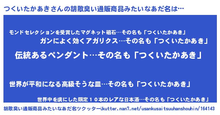 | 男性向けラノベタイトル風あだ名 | 『つくいたかあきの嫁は女の子じゃないと思った?』 |