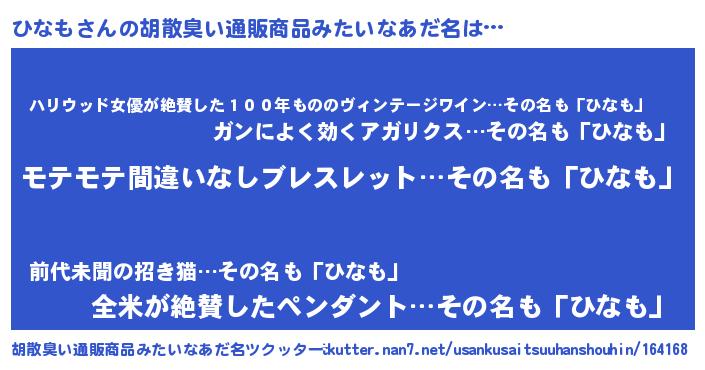 | 意味不明あだ名 | 『なめこ科ひなも属』『ペロリンひなも』 |