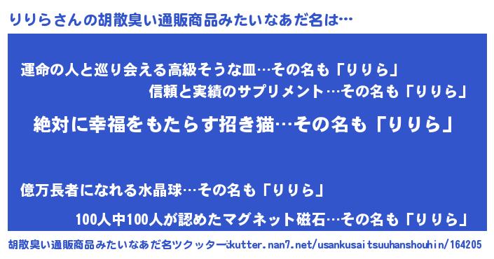 | 意味不明あだ名 | 『永久保存りりら』『りりらフォーエバー』 |