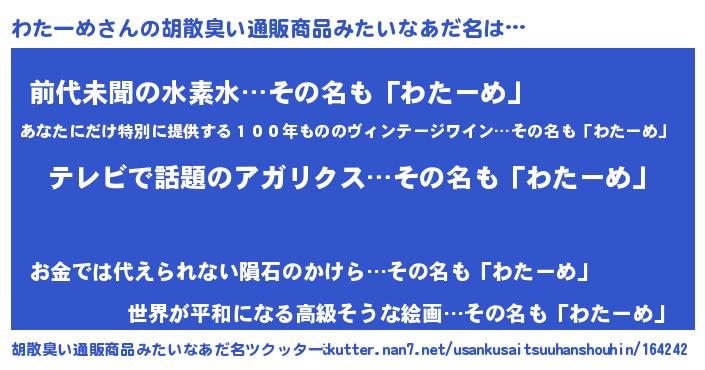 | 意味不明あだ名 | 『自称わたーめ』『永久保存わたーめ』 |
