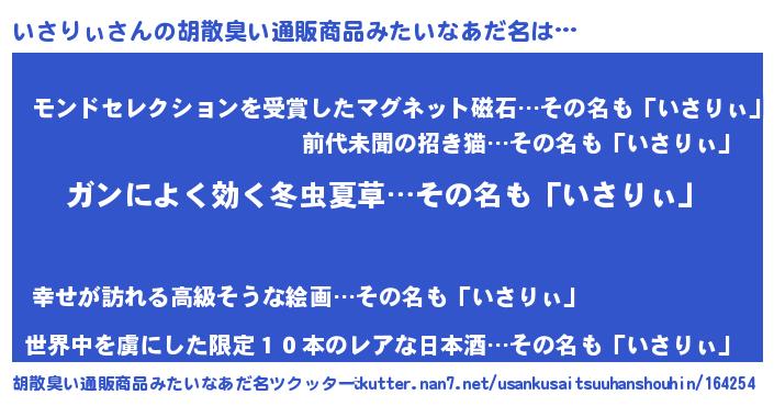 | 恥ずかしいあだ名 | 『イサリィデラックス』『いさちん』 |