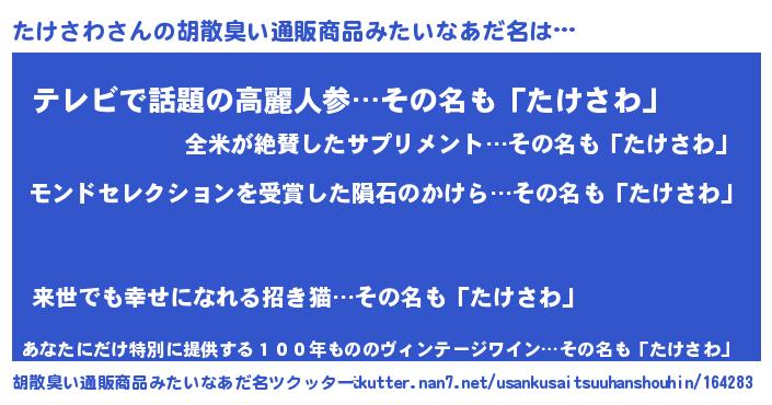 | 男性向けラノベタイトル風あだ名 | 『たけさわに滅ぼされるだけの簡単なお仕事です』 |