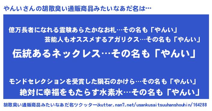 | 意味不明あだ名 | 『とにかく怪しいやんい』『自称やんい』 |