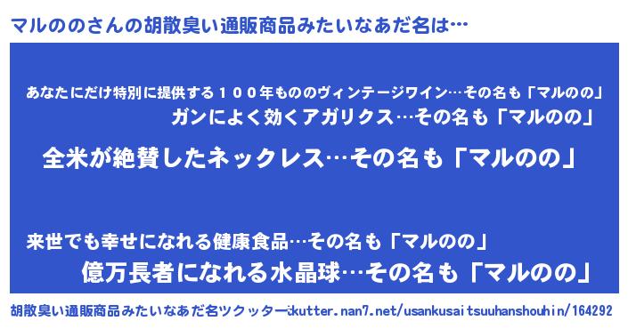 | 男性向けラノベタイトル風あだ名 | 『マルののの嫁は女の子じゃないと思った?』 |