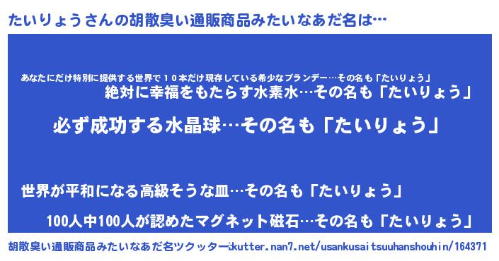| 男性向けラノベタイトル風あだ名 | 『たいりょうの憂鬱』『緋弾のタイリョウ』 |