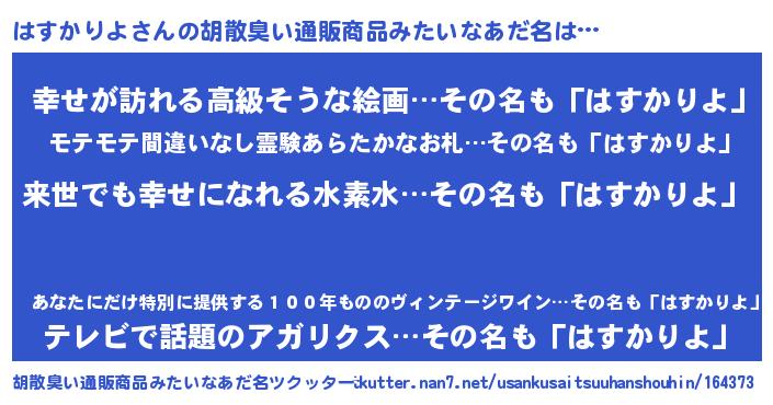 | ヘコむあだ名 | 『はすかりよ(遠い目)』『なまこ酢』 |