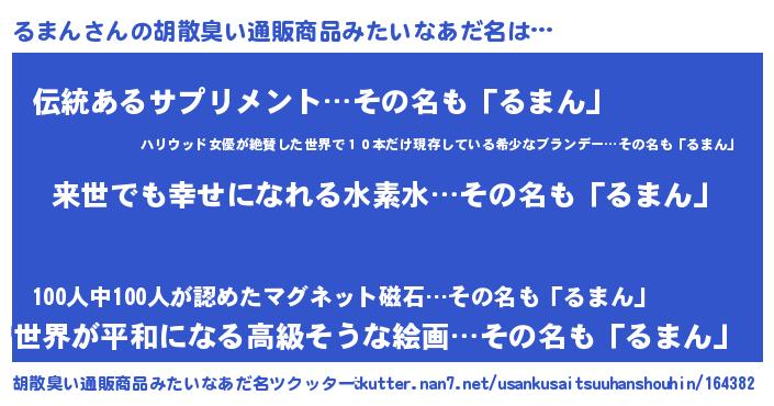 | ヘコむあだ名 | 『るまん(苦笑)』『るま太郎』『豆乳』 |