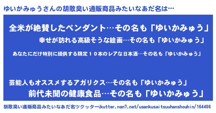 | 意味不明あだ名 | 『住所不定無職ゆいかみゅう(62歳)』 |