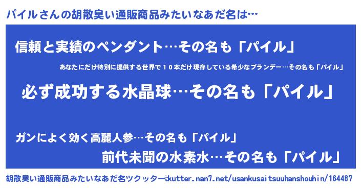 | 男性向けラノベタイトル風あだ名 | 『パイルの憂鬱』『魔弾の王とパイル』 |
