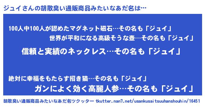 | ヒーロー風カッコイイあだ名 | 『暗黒騎士ジュ』『正義の使者ジュイ』 |