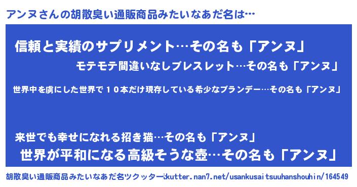 | 意味不明あだ名 | 『住所不定無職アンヌ(71歳)』 |