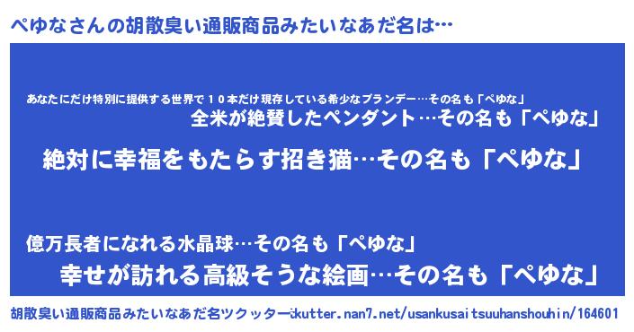 | ヘコむあだ名 | 『ぺゆな(笑)』『なまこ酢』『ぺゆお』 |