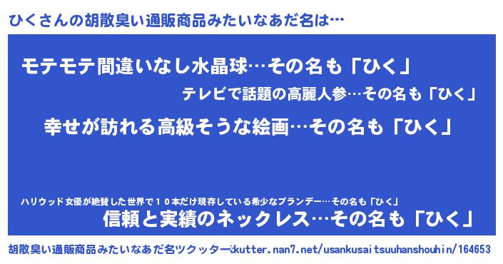 | 男性向けラノベタイトル風あだ名 | 『緋弾のヒク』『転生したらひくだった件』 |