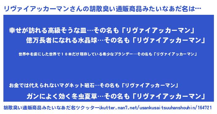 | 意味不明あだ名 | 『住所不定無職リヴァイアッカーマン(77歳)』 |