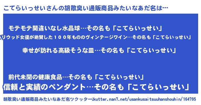 | 欧米人風あだ名 | 『こてらいっせいクリステル』 |