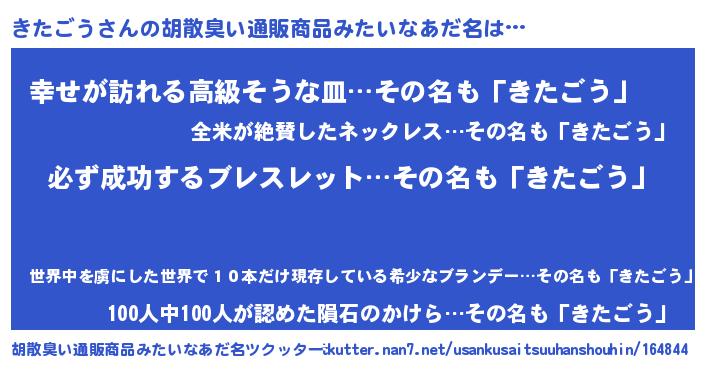 | 男性向けラノベタイトル風あだ名 | 『キタゴウスレイヤー』『きたごうの憂鬱』 |
