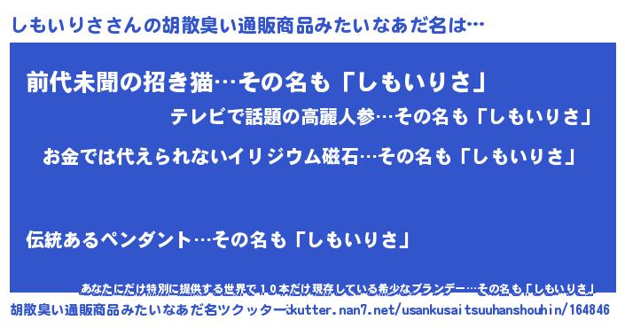 | ヘコむあだ名 | 『しもいりさ(笑)』『しもお』 |