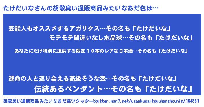 | 恥ずかしいあだ名 | 『タケダイナデラックス』『タケリンリン』 |