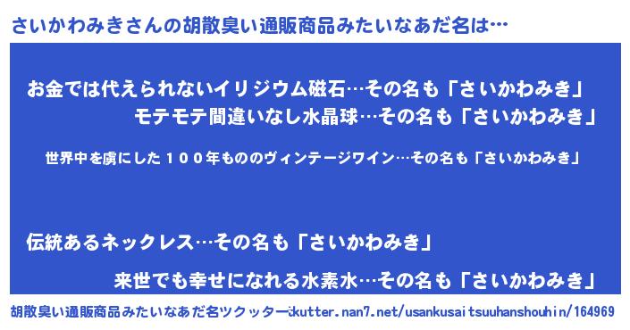 | 意味不明あだ名 | 『住所不定無職さいかわみき(7歳)』 |
