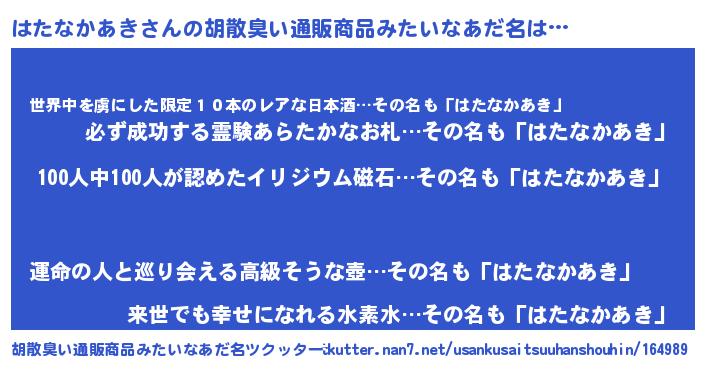 | ヘコむあだ名 | 『はたなかあき(笑)』『はたふぇ~』 |