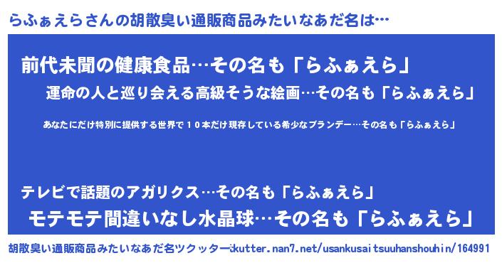 | ヘコむあだ名 | 『らふぁえら(震え声)』『らふもー』 |