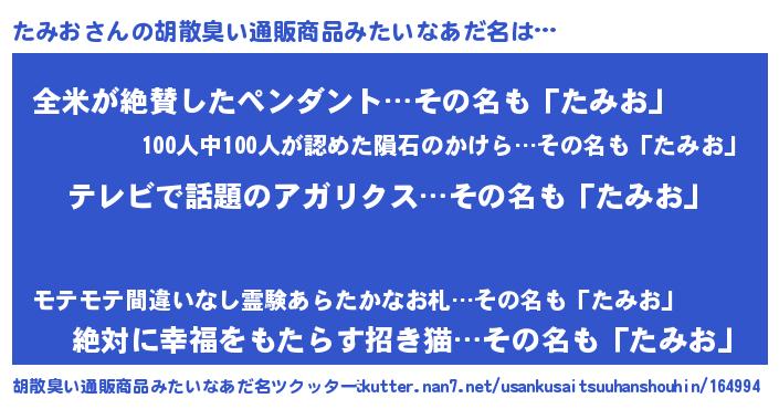 | 意味不明あだ名 | 『自称たみお』『とにかく怪しいたみお』 |