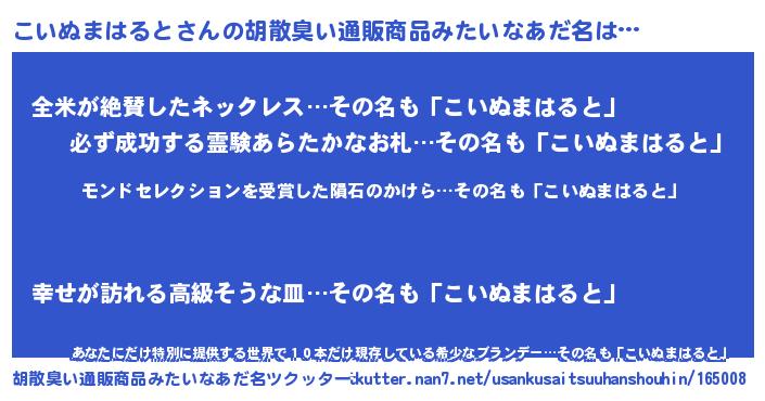 | 男性向けラノベタイトル風あだ名 | 『ノーゲーム・ノーコイヌマハルト』 |