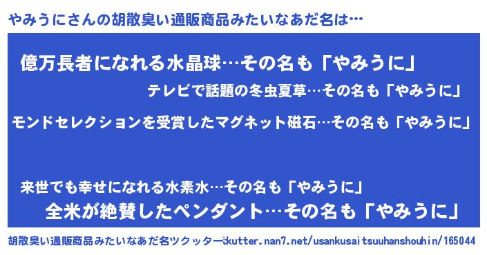 | 男性向けラノベタイトル風あだ名 | 『やみうに~年齢イコール彼女いない歴の魔法使い~』 |