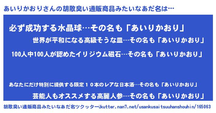 | 男性向けラノベタイトル風あだ名 | 『おまえをオタクにしてやるから、俺をあいりかおりにしてくれ! 』 |