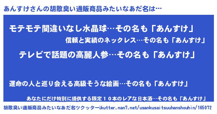 | 男性向けラノベタイトル風あだ名 | 『転生したらあんすけだった件』 |