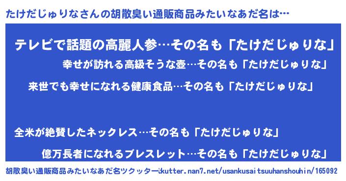 | ヘコむあだ名 | 『たけだじゅりな(笑)』『たけにー』 |