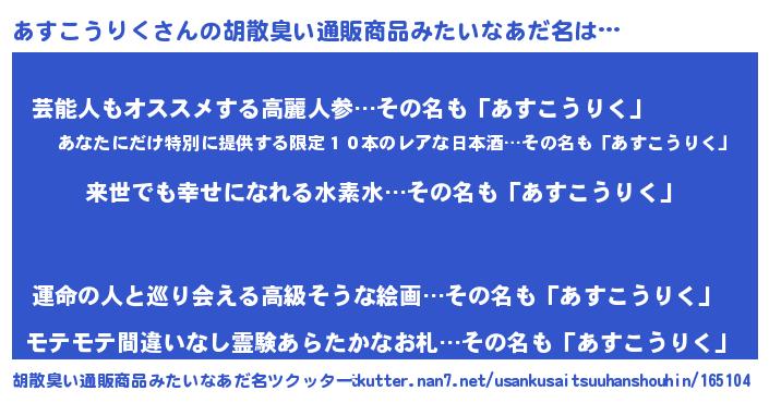 | 男性向けラノベタイトル風あだ名 | 『あすこうりくという概念が存在しない退屈な世界 』 |