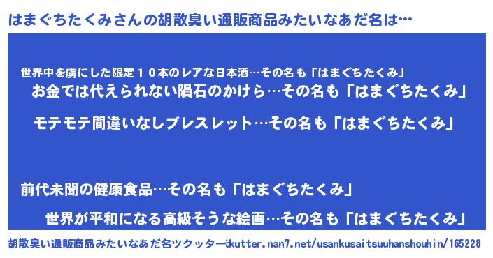 | 恥ずかしいあだ名 | 『プリティーはまぐちたくみ』『はまちん』 |