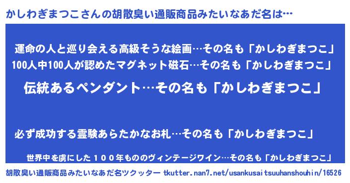 | 男性向けラノベタイトル風あだ名 | 『かしわぎまつこの嫁は女の子じゃないと思った?』 |