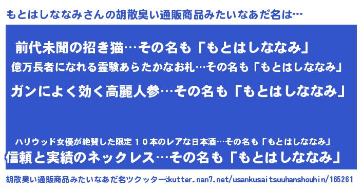 | ヘコむあだ名 | 『もとはしななみ(笑)』『もと太郎』 |