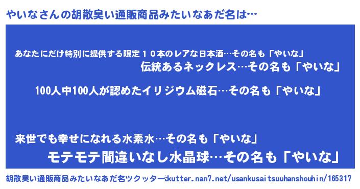 | ヘコむあだ名 | 『やいにゅー』『やいっぺ』『豆乳』 |