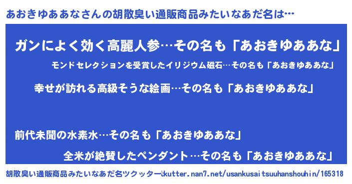| 男性向けラノベタイトル風あだ名 | 『やはりあおきゆああなの青春ラブコメはまちがっている 』 |