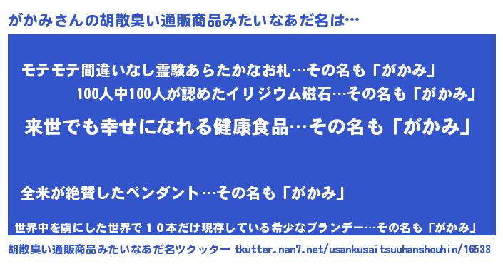 | ヘコむあだ名 | 『がかみ(笑)』『がかもー』『牛乳』 |