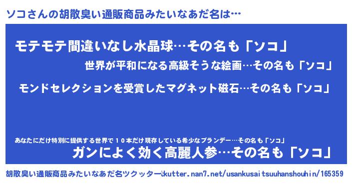 | ヒーロー風カッコイイあだ名 | 『慈愛の使者ソコ』『スーパーソコ』 |
