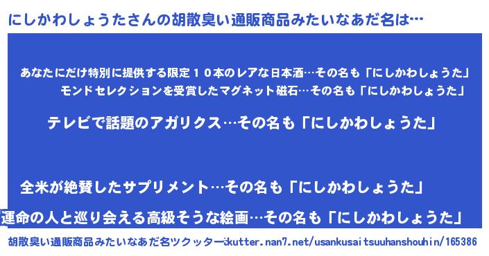 | 意味不明あだ名 | 『自称にしかわしょうた』 |