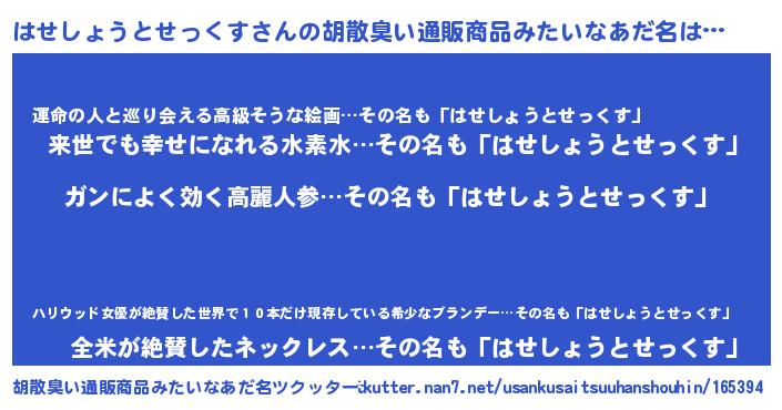 | ヒーロー風カッコイイあだ名 | 『ウルトラ戦士ハセショウトセックス』 |