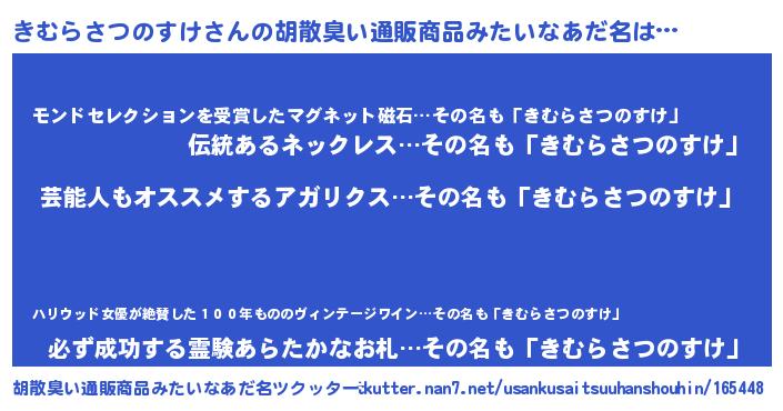 | 男性向けラノベタイトル風あだ名 | 『きむらさつのすけ~年齢イコール彼女いない歴の魔法使い~』 |