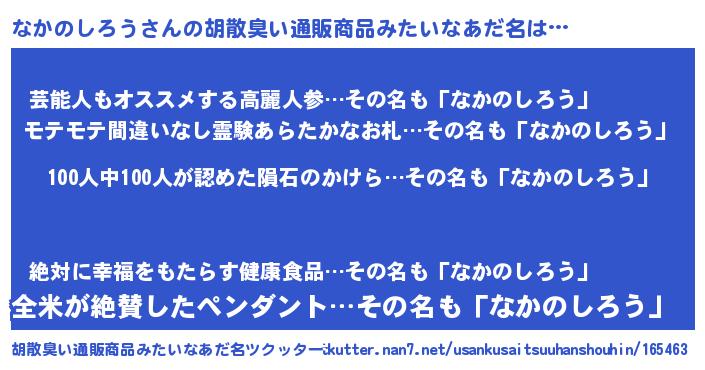 | 男性向けラノベタイトル風あだ名 | 『おまえをオタクにしてやるから、俺をなかのしろうにしてくれ! 』 |