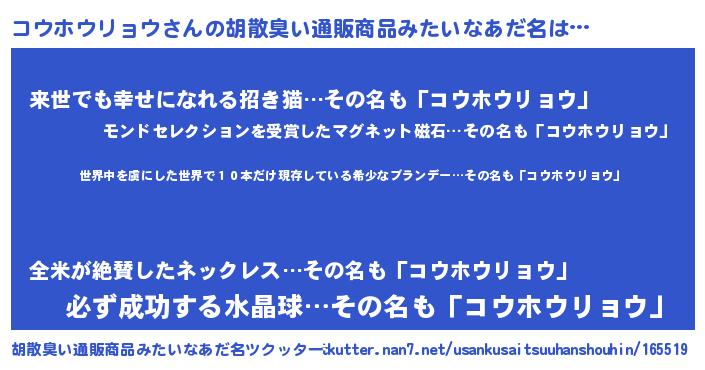 | 男性向けラノベタイトル風あだ名 | 『この素晴らしい世界にコウホウリョウを!』 |