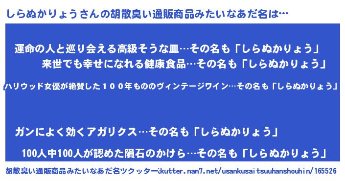 | 男性向けラノベタイトル風あだ名 | 『シラヌカリョウスレイヤー』 |