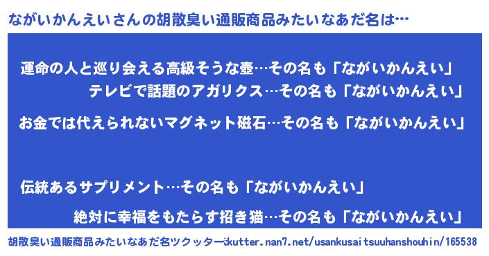 | 男性向けラノベタイトル風あだ名 | 『転生したらながいかんえいだった件』 |