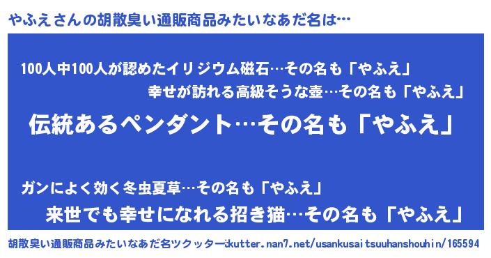 | 意味不明あだ名 | 『とにかく怪しいやふえ』『自称やふえ』 |