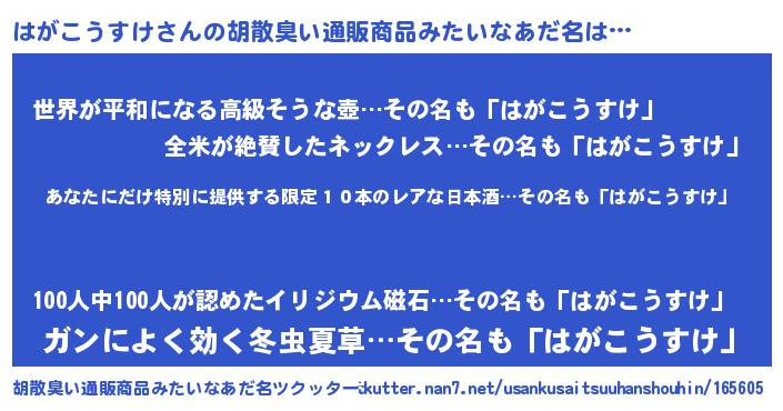 | 男性向けラノベタイトル風あだ名 | 『はがこうすけに滅ぼされるだけの簡単なお仕事です』 |
