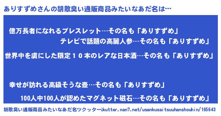 | 意味不明あだ名 | 『住所不定無職ありすずめ(59歳)』 |