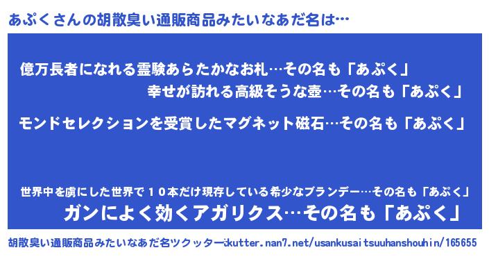 | ヒーロー風カッコイイあだ名 | 『天空の使者あぷく』『スーパーアプク』 |